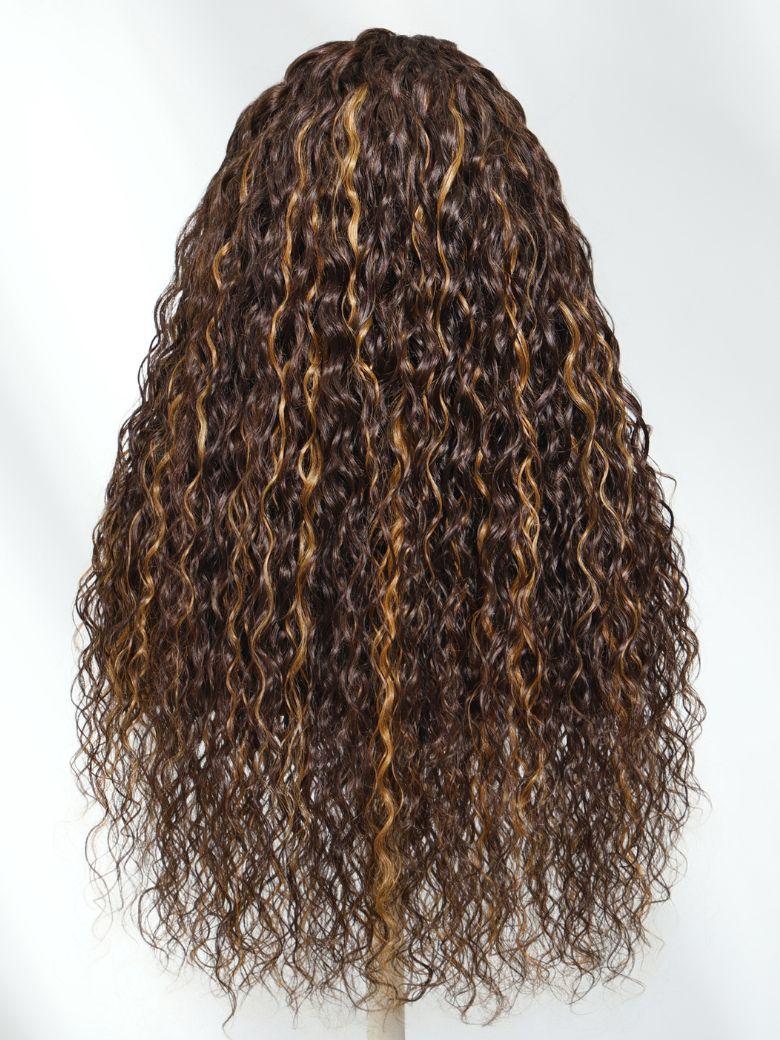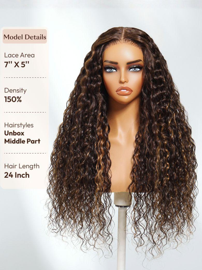 Lumivive Bye-Bye Knots™ 7×5 Lace Dark Toffee Brown with Auburn Highlights Water Wave Wig with Invisi Drawstring